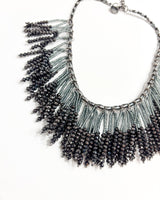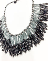 Collar gargantilla de flecos facetados en tonos marengo combinado con cuentas en diferentes formas.