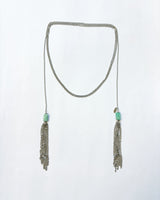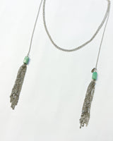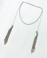 Collar extra largo en acero con dos terminaciones de flecos y piedra turquesa. Cadena de eslabones finos.