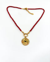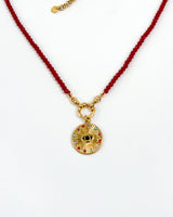 Collar gargantilla corto de cordón lleno de bolitas rojas combinado con apliques dorados. Colgante dorado con cristales de colores y ojo central con piedra verde esmeralda.