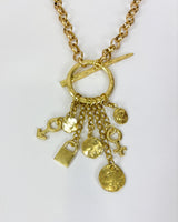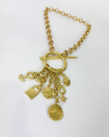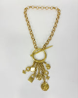 Collar dorado con grandes eslabones. Pieza circular y cadenas pequeñas que cuelgan con diferentes charlas de candado y signos. Precioso collar.