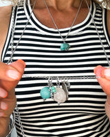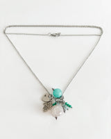 Collar con piedra turquesa y con charm de Mano de Fátima, de bolitas azules, blancas y corazón.