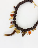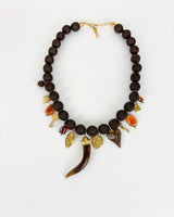 Collar dorado de bolas en tela marrón y charms de sol, piedras, cristal irisado y cuerno. Precioso collar.
