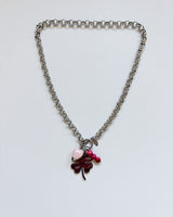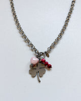 Collar de trébol, y corazón de cerámica rosa. Cadena combinada con bolas rosas. Acero.