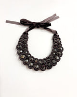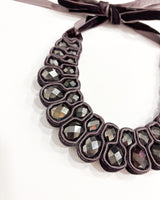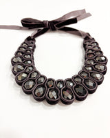 Collar gargantilla entrelazada con cinta de terciopelo y grandes cristales facetados. Queda pegado al cuello.