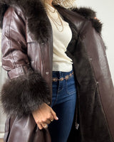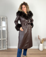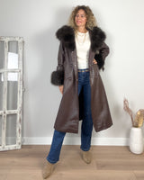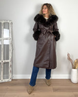 Abrigo largo marrón de polipiel cruzado. Forrado interior de tejido calentito, cuello desmontable de pelo y puños de pelo. Bolsillos laterales y capucha.