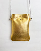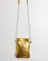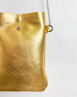 Bolso bandolera dorada. Diseño con cadena plata combinada con piel. Decorada con aplique plata.