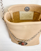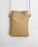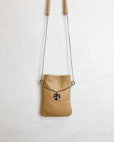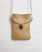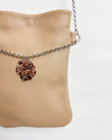 Bolso bandolera nude tostado. Diseño con cadena plata combinada con piel. Decorada con aplique plata con piedra caramelo.