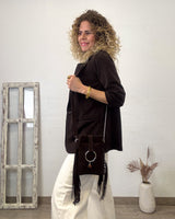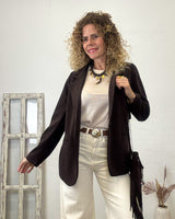 Blázer larga marrón chocolate de corte suelto con mucha caída. Abrochada con un único botón. Tejido de punto muy suave.