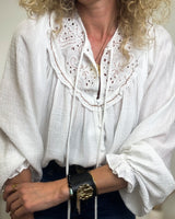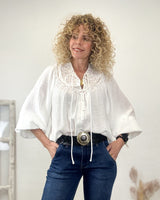Blusa blanca bordada con cuentas y formas caladas Escote pico. Corte amplio. Una delicia de blusa.
