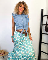 Blusa denim sin mangas de tejido muy fresquito y con volantes. Botones en el delantero y pequeña lazada. Blusa preciosa y muy estilosa.