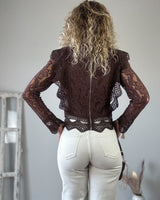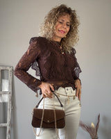 Blusa marrón de encaje. Talle corto. Mangas semitransparentes. Cremallera en la parte trasera. Una delicia de blusa.