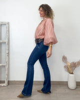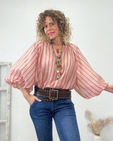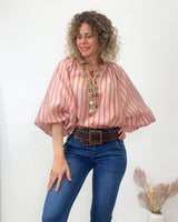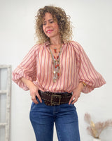 Blusa fluida de rayas en color rosas, rojo y beige. Escote pico y corte suelto. Bonitas mangas globo con goma.