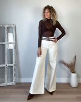 Body marrón chocolate decorado con pedrería color caramelo. Cuello holter. Tejido semitransparente.