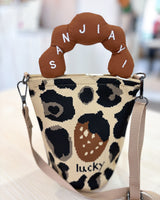 Bolso cubo de punto grueso en tonos marrones print, y crudo. Asas acolchadas y cadena larga para intercambiar. Cremallera de cierre.