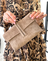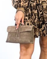 Bolso de serraje en color topo. Cinta para colocar en la muñeca y cinta para colocar de bandolera.