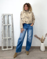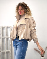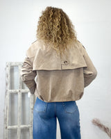 Bomber color arena efecto ante. Cuello solapa, con capa en los hombros y corte cruzado. Abotonada en la parte delantera. Cinturilla fruncida.