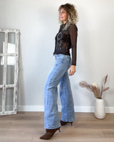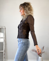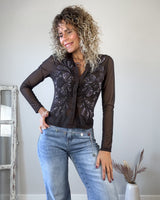 Blusa chocolate de pedrería haciendo flores de cuentas y lentejuelas plata. Talle corto. Mangas y cuerpo semitransparentes. Una delicia de blusa.