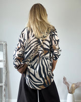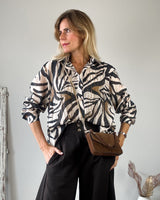 Camisa marrón print en tonos negros, beige y marrones. Muy fluida y vaporosa. Muy bonita y estilosa.