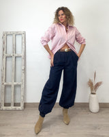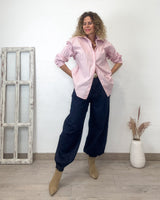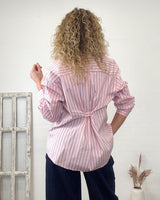 Camisa rosa larga de rayas en tono marrón y azul. Corte amplio con detalle de botón pinza para hacerla más estrecha.