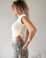 Camiseta beige cuello holter y manga corta. Punto elástico. Drapeado lateral con goma para poderla fruncir