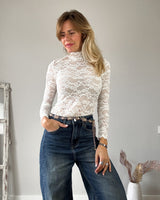 Camiseta beige de estilo romántico. Cuello redondo, manga larga y tejido muy agradable.