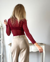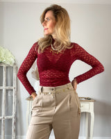 Camiseta granate ajustada tipo encaje. Corte ajustado y fruncido en laterales de la cintura. Una preciosidad.
