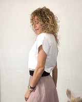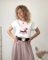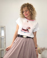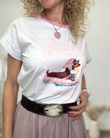 Camiseta blanca con perro en tonos marrones y rosas. Manga corta. Ribete de punto rosa en el cuello.