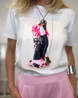 Camiseta blanca con chica en color rojo y letras con brillo. Manga corta.