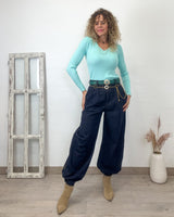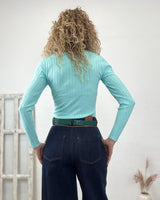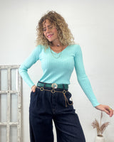 Camiseta azul turquesa de cuello pico básico. Tejido elástico.