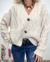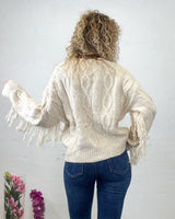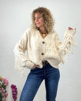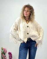 Cardigan beige de cuello pico. Flecos en las mangas que bordean todo el pecho. Tejido elástico.