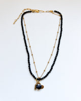 Collar de dos cadenas con bolitas negras y Charm de corazón y bolitas. Cadenas de diferentes largos y formas terminadas.