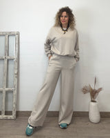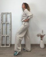 Conjunto beige casual de tejido elástico. Pantalón con cinturilla de goma invisible. Corte recto y suelto con bolsillos laterales. Sudadera cuello redondo y corte abollonado con mucha caída.