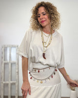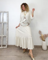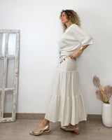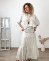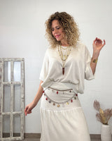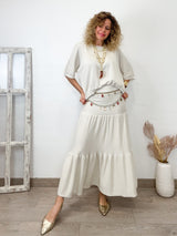 Conjunto beige con lurex de tejido elástico. Falda con cinturilla de goma. Corte de vuelo y suelto. Jersey cuello redondo y corte amplio con mucha caída.