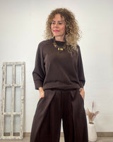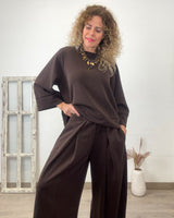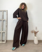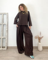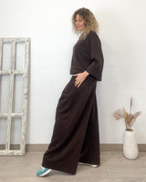 Conjunto marrón casual de tejido elástico. Pantalón con cinturilla de goma y cordón. Corte recto y suelto con bolsillos laterales. Sudadera cuello redondo y corte suelto con mucha caída.