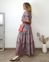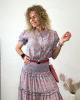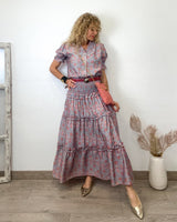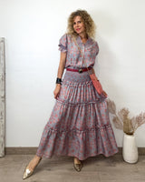 Falda larga rosa y azul claro intenso con estampado de flor. Corte en varias alturas. Cinturilla engomada. Tejido fluído.