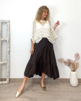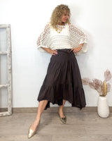 Falda marrón desigual y con vuelo. Cinturilla trasera con goma. Forro interior y cinturón. Una falda preciosa de tejido muy bonito.