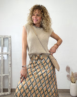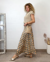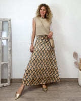 Falda larga punto en tonos verde, mostaza y tostado con una preciosa caída y estampado geométrico. Una falda preciosa de tejido muy bonito.