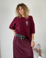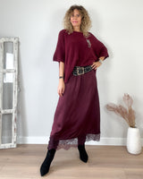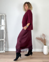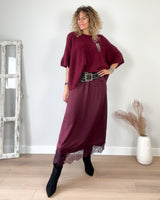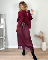 Falda larga satinada color picota. Corte suelto con detalle de encaje en la parte baja. Cinturilla de goma.