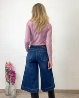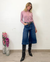 Jeans bermuda desgastado de corte amplio. Bajo con costura de vuelta. Tejido blandito y elástico.