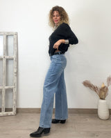 Jeans claro con detalle de estrella con tachas en los bolsillos traseros y corte recto. Tejido blandito y elástico.