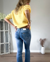 Jeans azul push up algo acampanado. Corte ajustado de pierna. Llevan elastano que se adapta a las curvas.