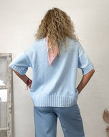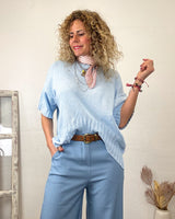 Jersey azul de media manga y corte desigual. Elastico en puños y cintura.