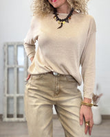 Jersey beige con dorado de manga larga. Elástico en puños y cinturilla. Cuello redondo. Tejido fino.