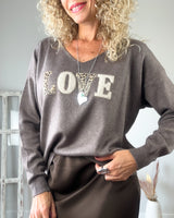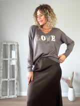Jersey tostado de tejido muy agradable, punto fino. Escote pico y letras LOVE en animal print.