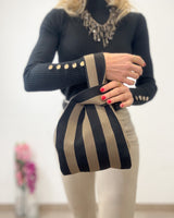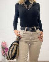 Jersey negro cuello alto y tejido muy agradable, punto fino. Detalle de botones dorados en puños.