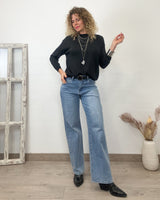 Jersey negro con hilo plata de manga larga. Elástico en puños y cinturilla. Cuello redondo. Tejido fino.