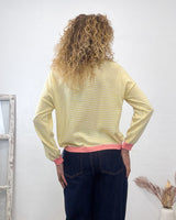 Jersey de raya amarillo con ribete salmón. Tejido suave, corte recto.