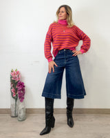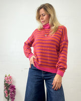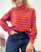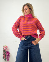 Jersey de raya fina fucsia y naranja con puños y cuello color fucsia. Corte amplío.