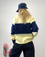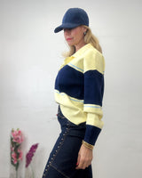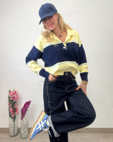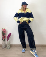 Jersey de raya ancha amarillo y azul marino. Corte amplío y ajustado en la cintura.
