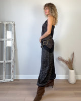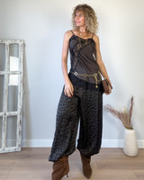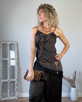 Top lencero marrón y negro con puntilla y corte pico. Tirante regulable y goma en la espalda.